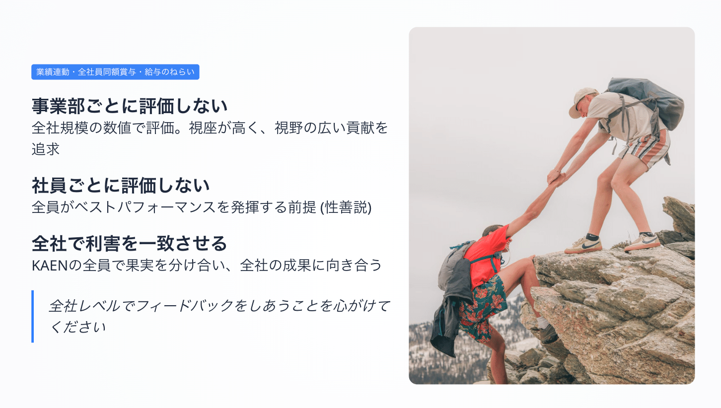 余談ですが、KAENではある事業が他の事業を利用することが結構あります。普通の評価制度であれば、自社からの売上は計上できない(それこそ循環取引になるので)から、自社事業のためにCSコストをかけるのはやめとこうということになると思います。ただKAENは全社の数値のみで評価するため、**売上にならないとかそんなことは関係なく全力で他事業を支援する**という姿勢が生まれています。