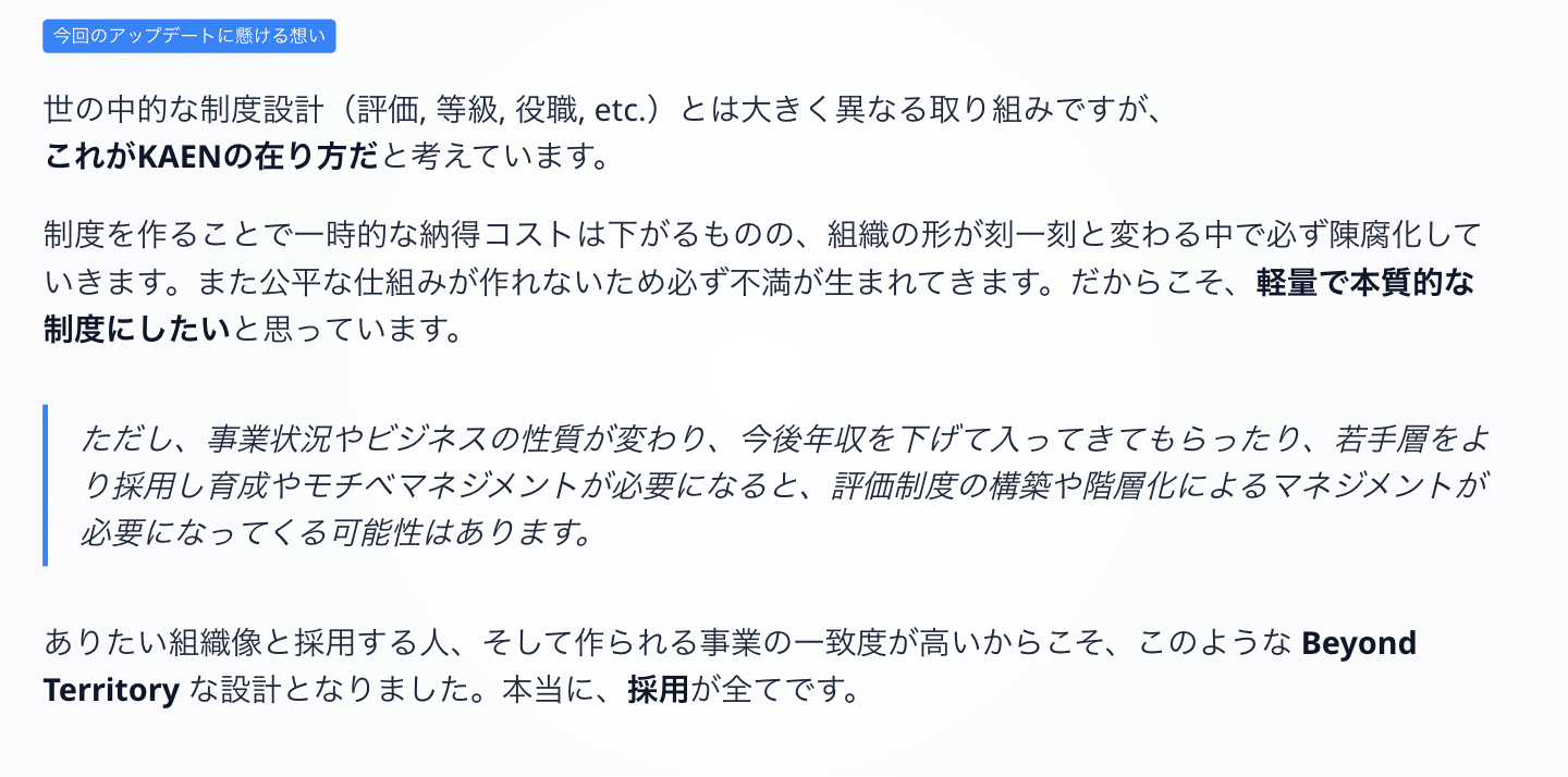 もちろんこの評価報酬制度は、今のフェーズと集まっている人の性質を考慮した結果であり、状況が変われば当然制度も変わると思っています。