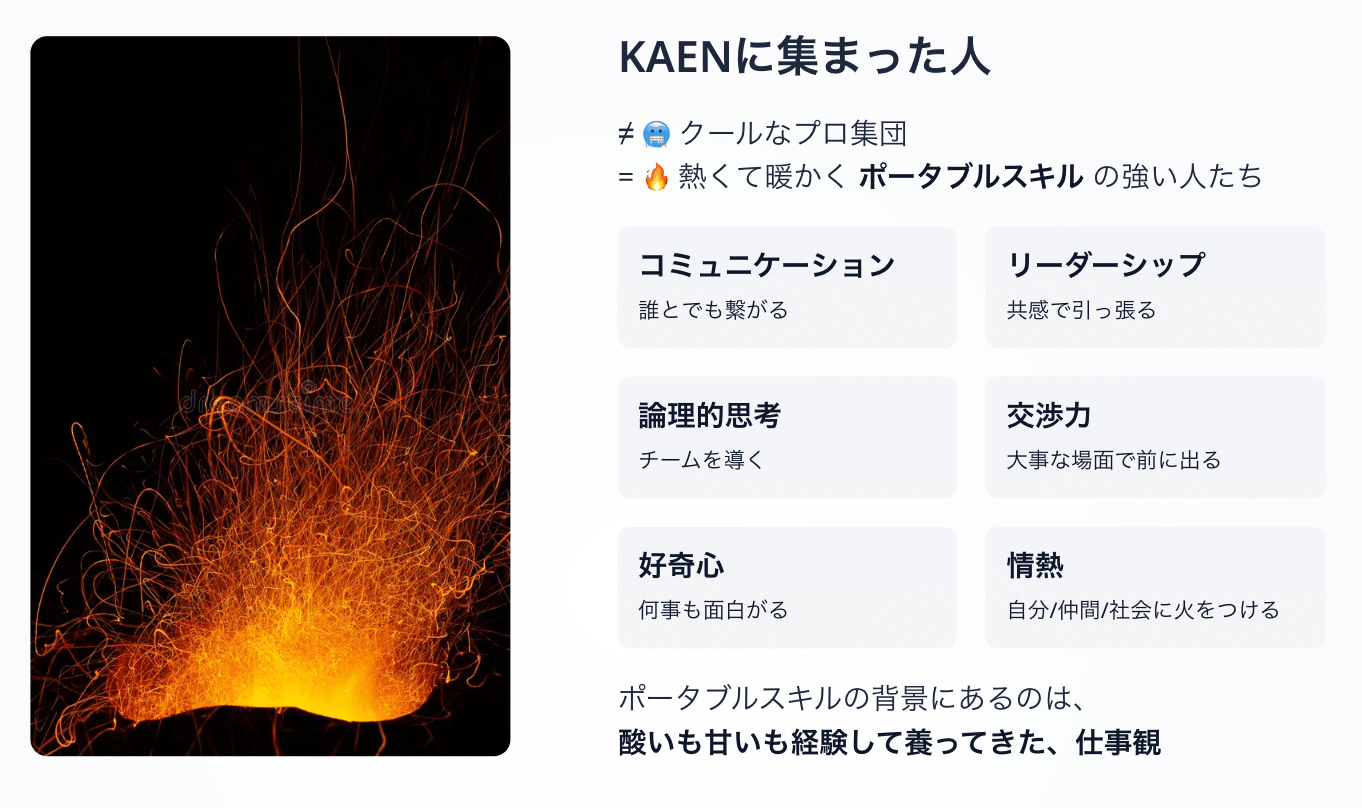 だからこそKAENは、酸いも甘いも経験してきた、ポータブルスキルが強い人を丁寧に採用してきました。「KAENさんは誰とお会いしてもめちゃいい人たちですよね」と言われることは自慢です。